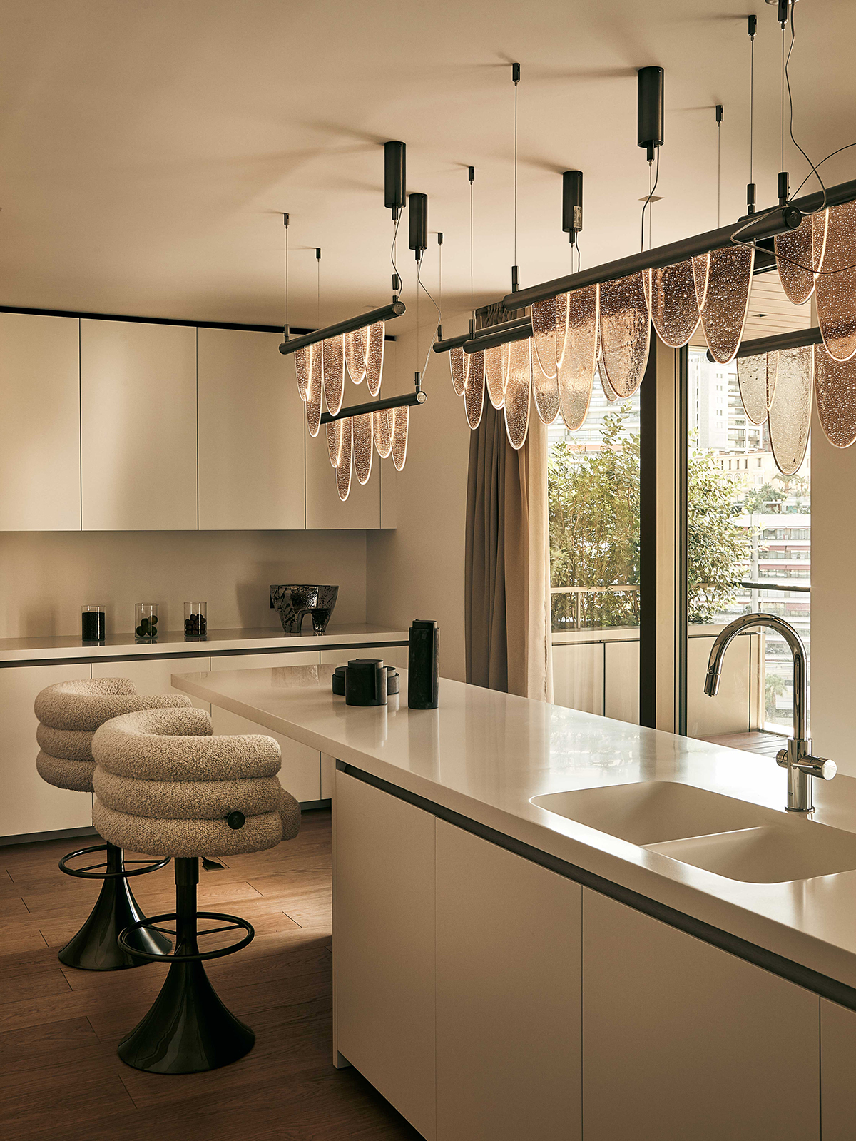 На светлой и просторной кухне мотив скругленных элементов прослеживается в барных стульях Voluptas и подвесном светильнике Parade.