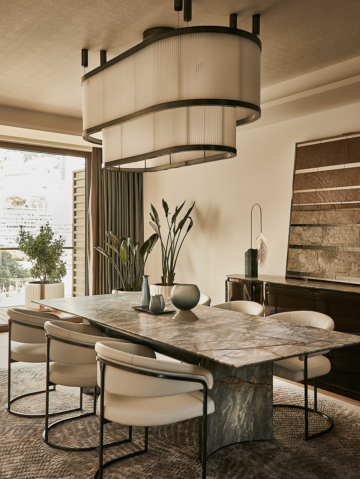 В столовой зоне — монументальный обеденный стол Kerwan, вогнутые ножки которого визуально поддерживаются дугообразным каркасом стульев Clem и люстры Giano.