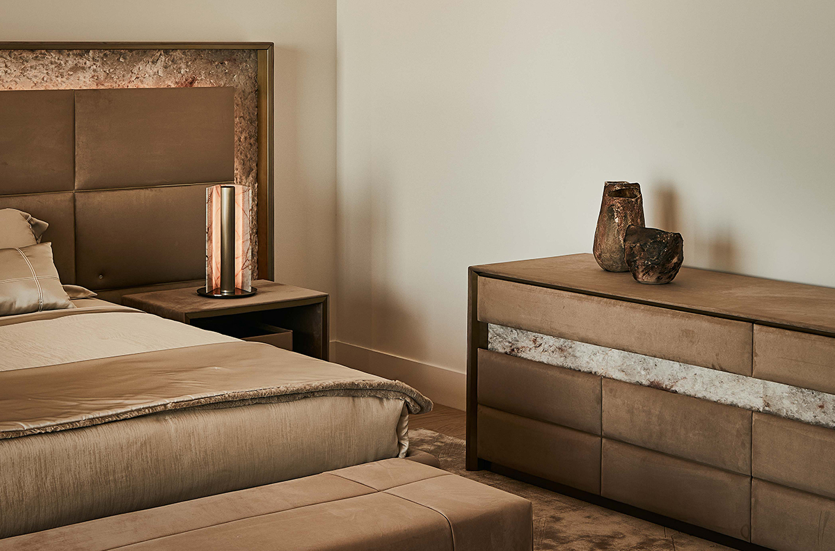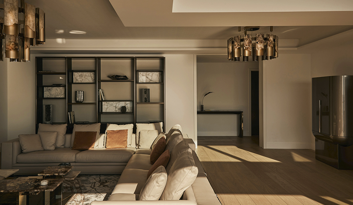 В столовой зоне — монументальный обеденный стол Kerwan, вогнутые ножки которого визуально поддерживаются дугообразным каркасом стульев Clem и люстры Giano.
