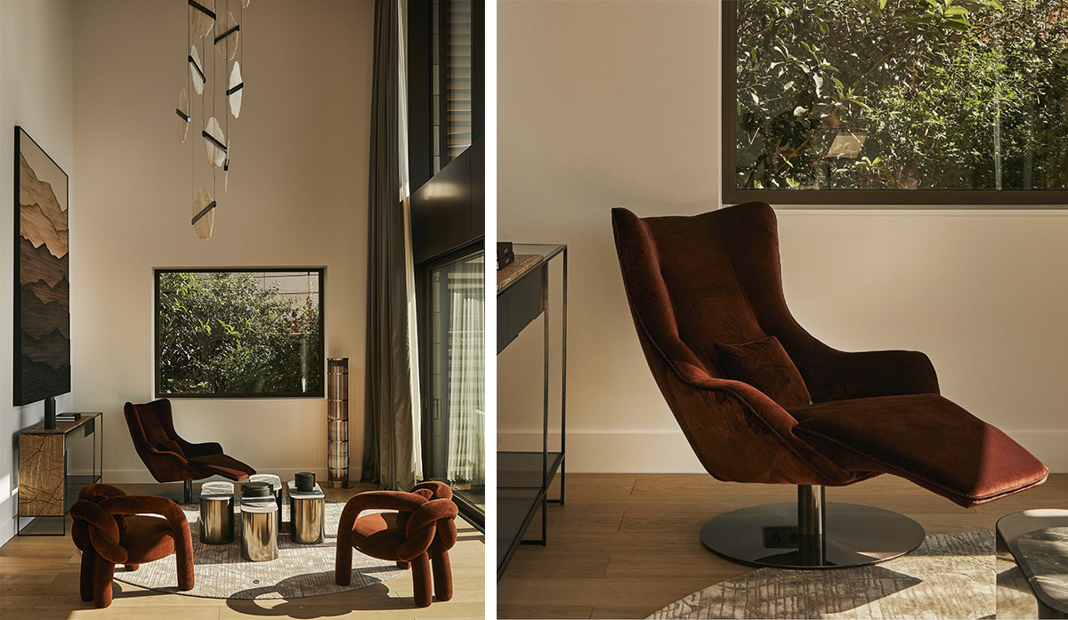 На этом же уровне находится рабочий кабинет с зоной отдыха, меблированной новинками: диваном Walker и креслами Aura.Ваш запрос принят в обработку.