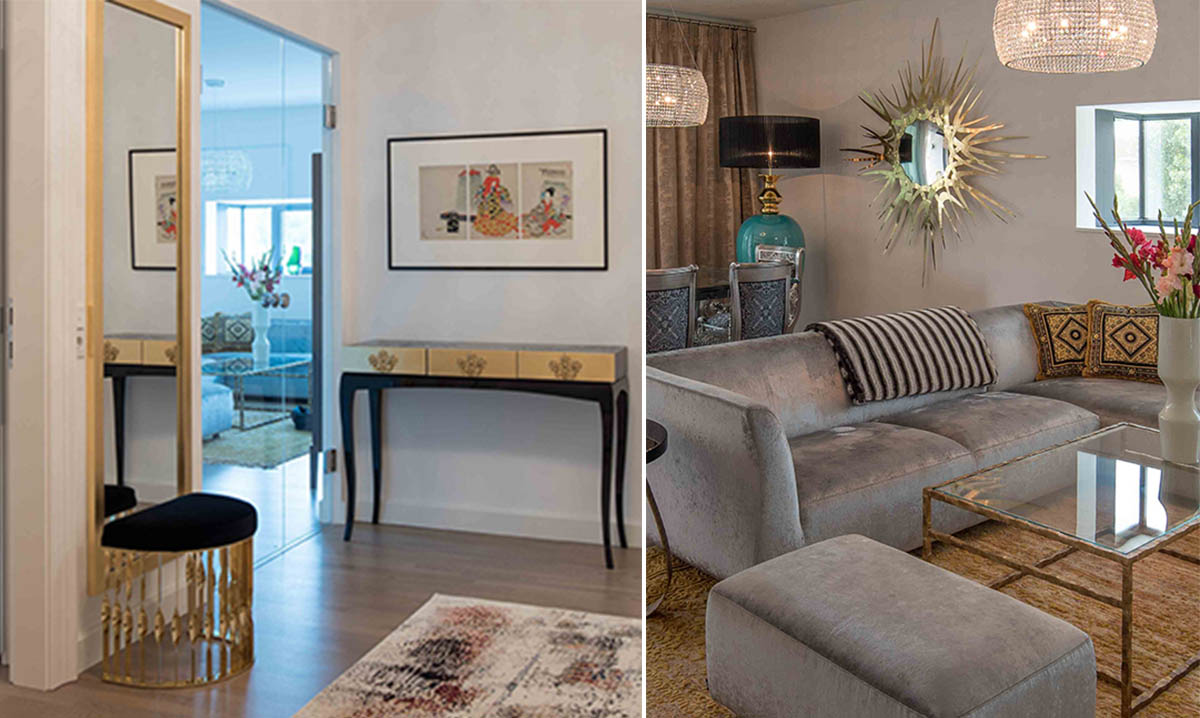 Изысканная, но очень эклектичная вилла была спроектирована австрийской компанией Elke Altenberger Interior Design в Вене. Торшер с бирюзовым основанием, золотой ножкой и черным абажуром и золотое зеркало Guilt оживляют нейтральную атмосферу и становятся изысканным «лакомством» в столовой. Фойе дополняет витой полукруглый табурет Mandy из полированной латуни с черным бархатным сиденьем.